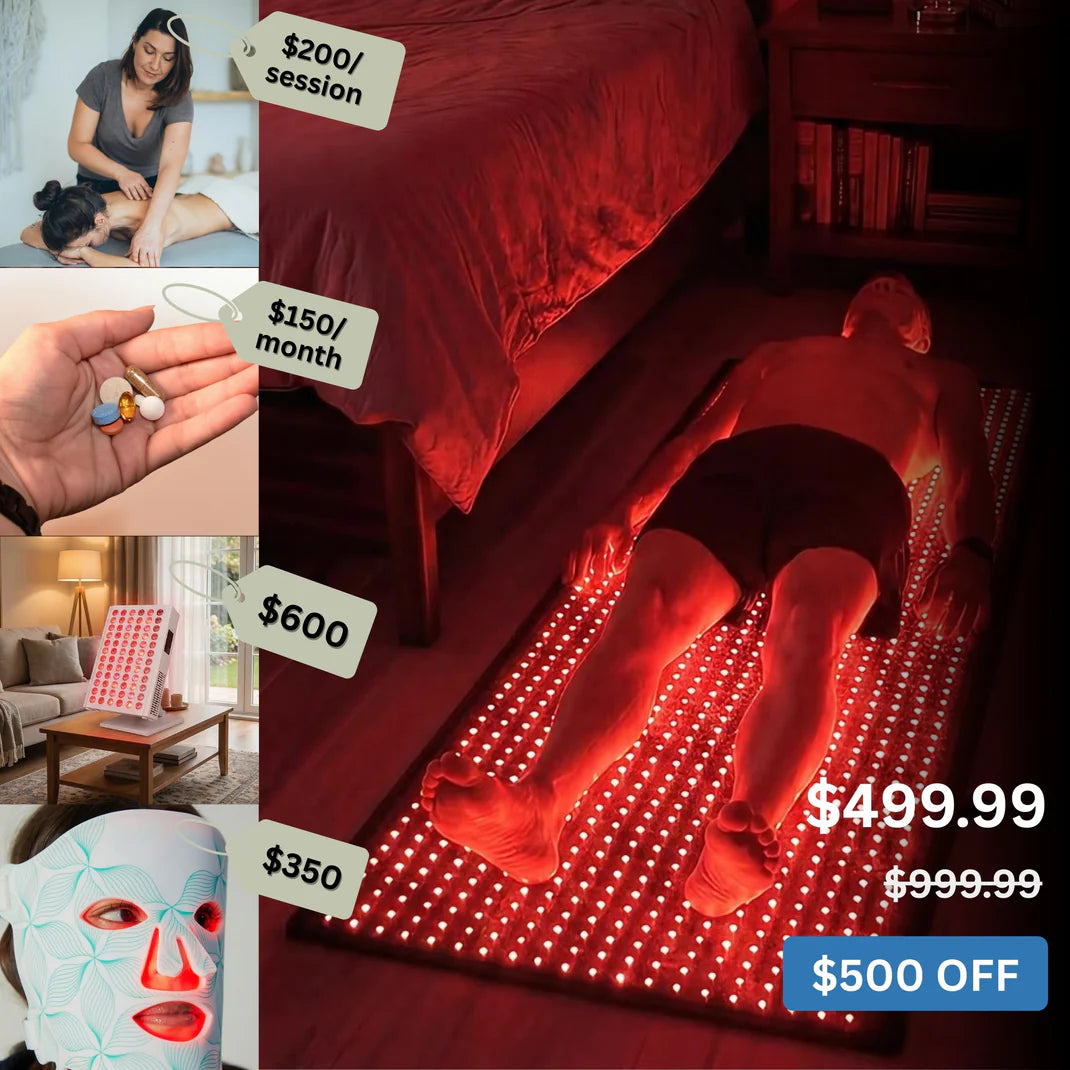 Physical therapy sessions cost hundreds of dollars each visit, and those costs add up fast. Other at-home red light devices run over a thousand dollars. The mat gives you professional-grade treatment at home for a one-time cost, and right now it's $500 off.